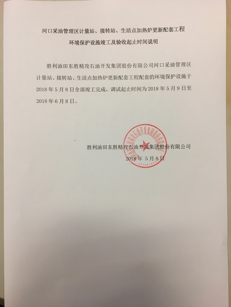 河口采油管理區(qū)計量站、接轉(zhuǎn)站、生活點加熱爐更新配套工程環(huán)境保護設(shè)施竣工及驗收起止時間說明
