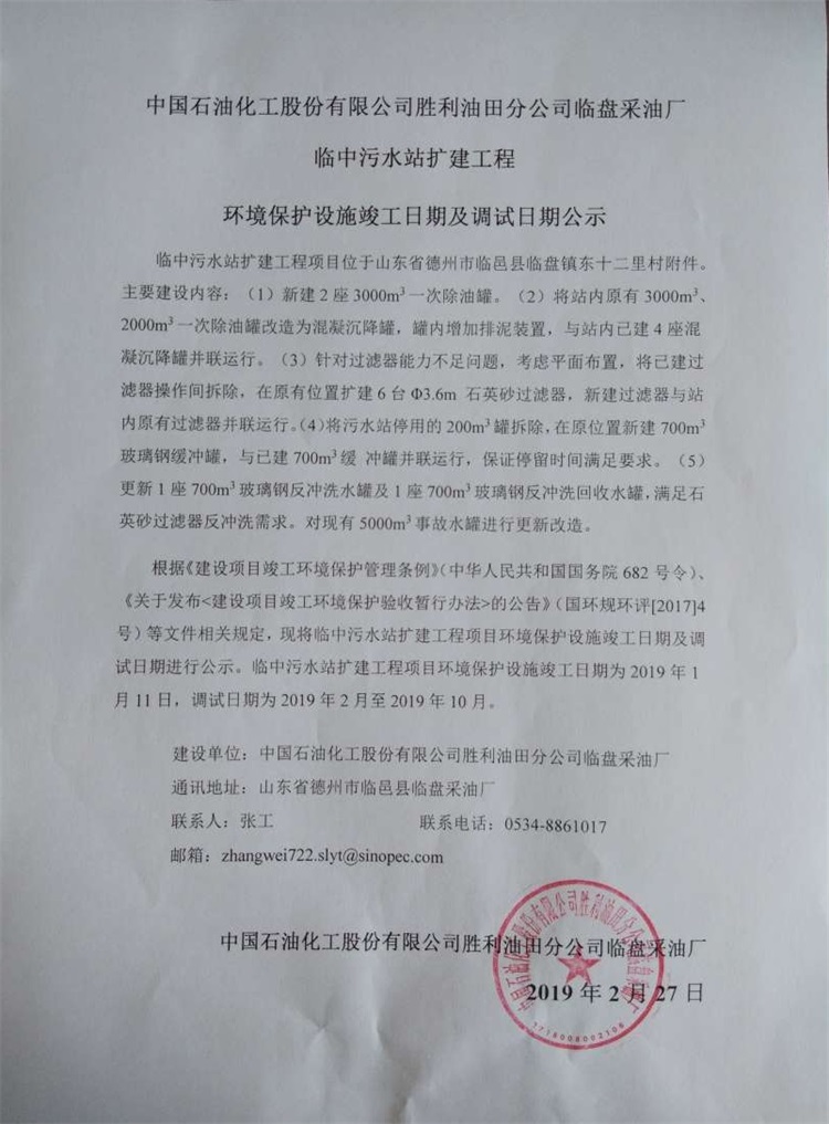 中國石油化工股份有限公司勝利油田分公司臨盤采油廠臨中污水站擴(kuò)建工程環(huán)境保護(hù)設(shè)施竣工日期及調(diào)試日期公示