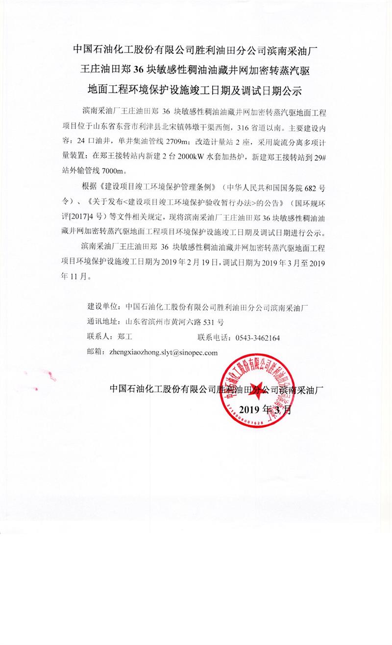 中國石油化工股份有限公司勝利油田分公司濱南采油廠王莊油田鄭36塊敏感性稠油油藏井網(wǎng)加密轉(zhuǎn)蒸汽驅(qū)地面工程環(huán)境保護(hù)設(shè)施竣工日期及調(diào)試日期公示